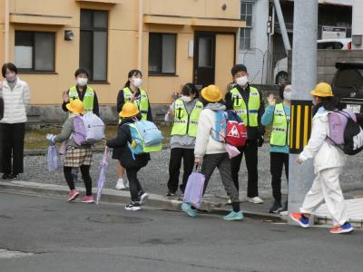 川之石でのあいさつ活動は、交流拠点施設「みなせ」付近。小学生は登校時間が早くて、7時30分にはほとんど通過していきます。あいさつだけでなく、「手を振って笑顔で」というのが、川之石の特徴です。なかなかかわいいあいさつの姿でした。