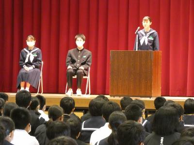 終業式では、各学年の代表が2学期を振り返っての反省と冬休みに向けての抱負が発表しました。発表を聞いていると、いろいろな行事のことがそのときの感動と一緒に思い出されました。3年生はいよいよ始まる受験に向けてとことん勉強するという力強い宣言もありました。私からは、2学期の印象深かった二つのことを話し、命を大切にすることを伝えました。