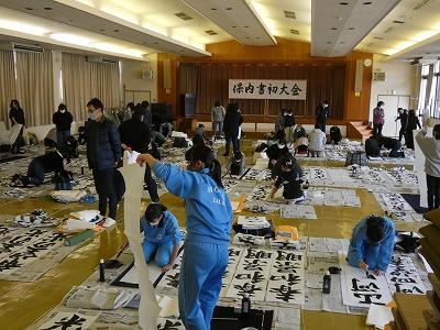 保内地区・日土地区から、小中学生とその保護者の方々がたくさん集まりました。保内中からは1年生3名・3年生5名が参加しました。墨のいいにおいが漂う公民館。子どもたちは地域在住の講師の方々にアドバイスを受けながら、一心不乱に筆を動かしていました。