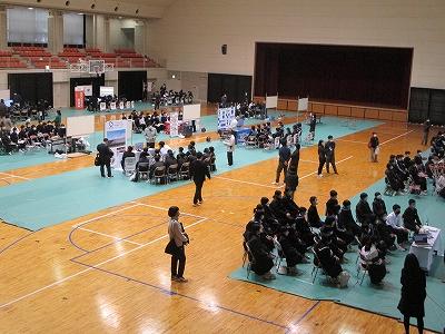 今日の午後、八幡浜市スポーツセンターメインアリーナで、市内4中学校の1年生対象の合同企業説明会が行われました。この活動は、八幡浜市政策推進室の企画により、昨年から行われる予定でしたが、コロナウイルス感染症のために、今年度がはじめての開催となりました。市内、14の事業所(1事業所は残念ながら都合で来られませんでした)から、それぞれの会社の特徴や仕事内容などを20分にまとめてもらったものを聞きました。すべての企業の説明は時間の都合上、回れませんでしたので、生徒はグループに分かれ3企業の説明を聞いて回りました。本校では、2年生の7月にジョブチャレンジU-15(職場体験活動)を行っています。今日の説明会をぜひ生かしてほしいと思います。